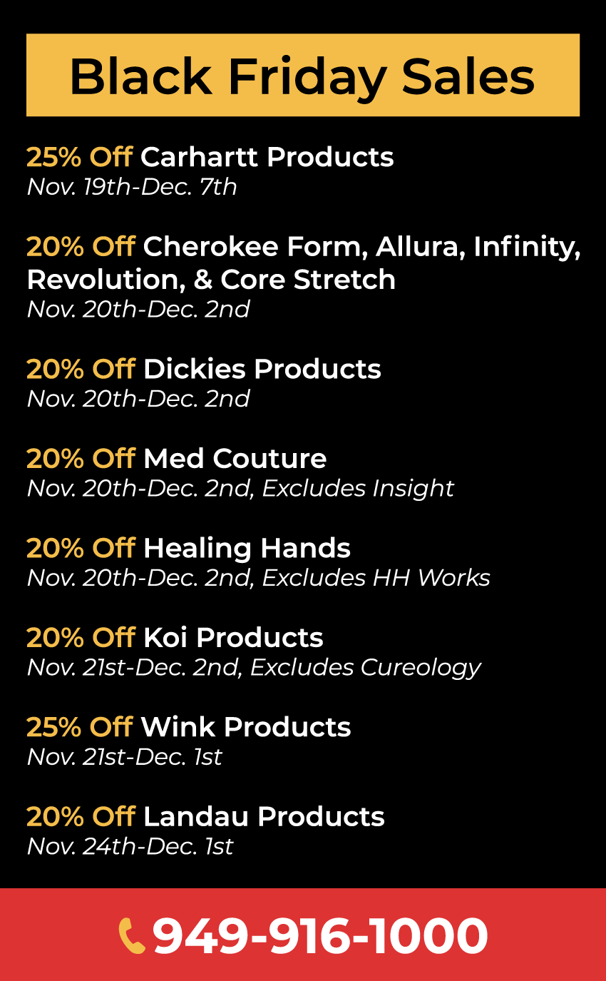 Our boutique ambiance specializes in high quality scrubs and we are proud to serve the men and women of Orange County. We thrive to make your shopping experience comfortable, easy and pleasant!